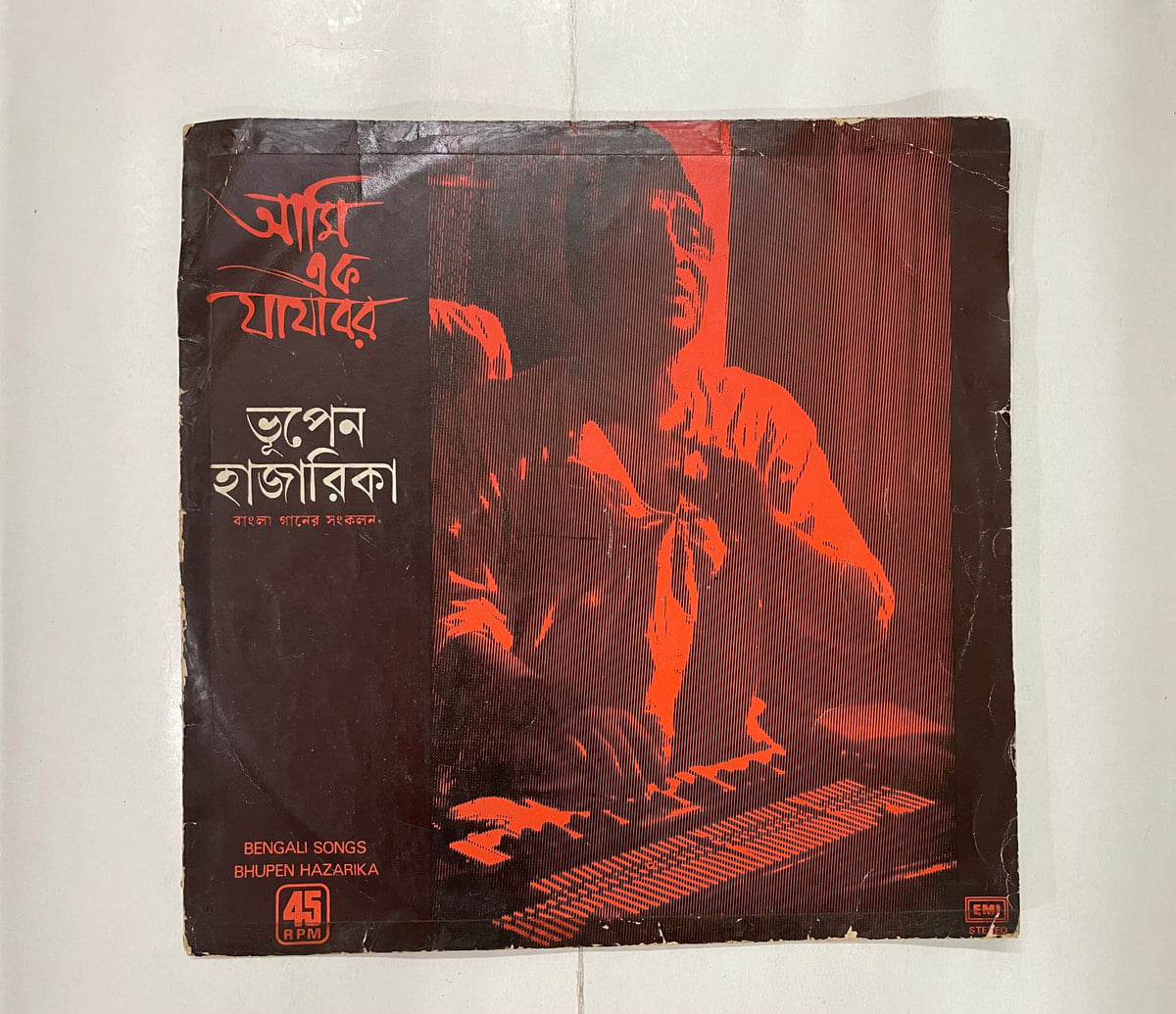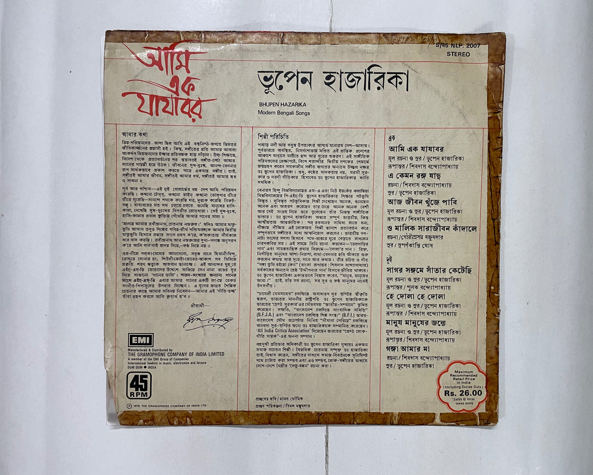 This 1978 His Master’s Voice pressing of Bhupen Hazarika’s classic “আমি এক যাযাবর” feels like opening an old family story you almost forgot. The record itself plays in Very Good Minus condition: clean grooves, only light surface noise in the quiet bits, and that warm analog body his voice deserves. The cover, though, is in Poor shape—scuffed, worn, and clearly well-traveled—almost fitting for an album about the life of a wanderer.