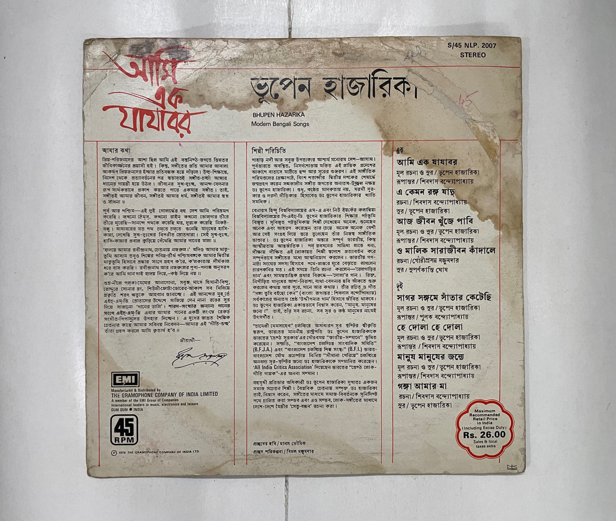 This 1978 His Master’s Voice pressing of Bhupen Hazarika’s “আমি এক যাযাবর” feels like a late-night tea stall conversation pressed onto wax. The jacket has clearly seen a few rail journeys and monsoons — cover condition is Poor — but the LP itself spins in Very Good Minus, with that gentle, lived-in surface sound that suits Hazarika’s weathered voice.