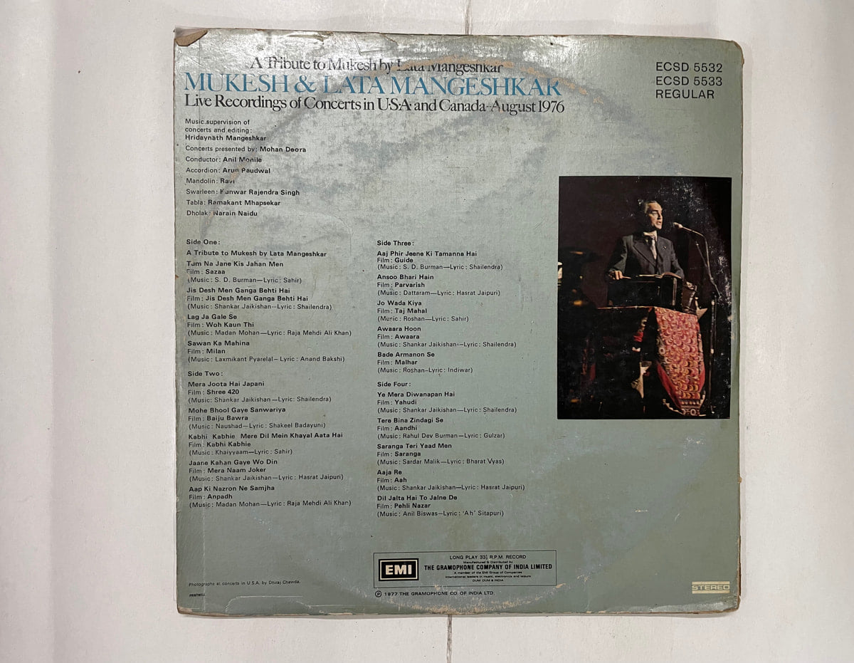Hear Lata salute Mukesh in warm 1976 tour tapes—Buy A Tribute To Mukesh By Lata Mangeshkar (Live Recordings Of Concerts In U•S•A• And Canada-August 1976) vinyl LP in Very Good Minus condition Today!