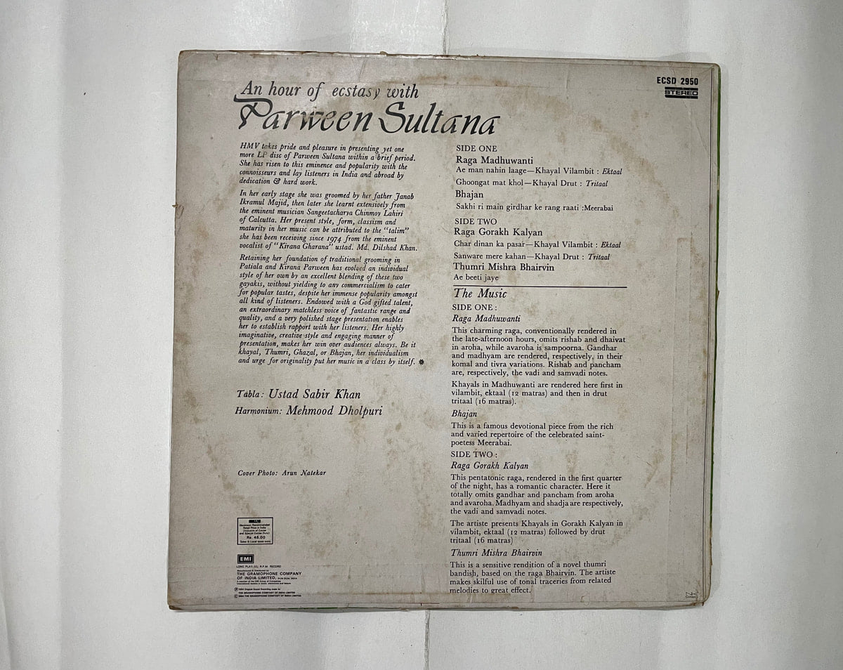 Parween Sultana’s voice glows on this 1983 vinyl—Buy An Hour of Ecstasy With Parween Sultana vinyl LP in Very Good Minus condition Today!
