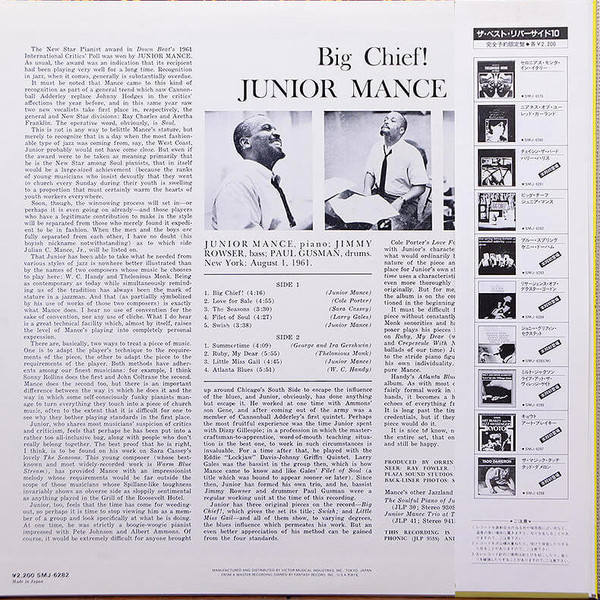 What sets ‘Big Chief!’ apart is its warmth and honesty. Mance’s playing is conversational—he’s not out to dazzle for the sake of virtuosity, but to communicate feeling and groove. The set list nods to New Orleans with the title track, while original compositions and standards alike gain new life under his touch. For collectors, it’s a snapshot of a pianist at his creative peak, backed by musicians who share his dedication to the art of the trio. Whether you’re spinning this on a quiet morning or a relaxed evening, ‘Big Chief!’ is a keeper—a record that rewards close listening and repeated returns.