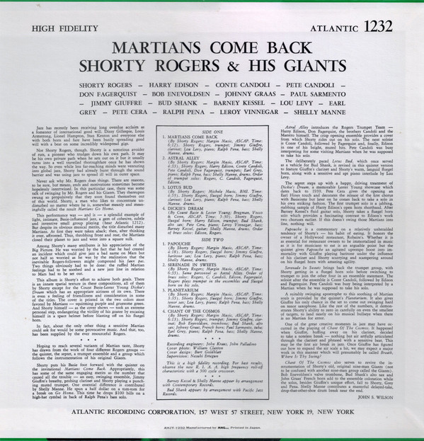 Rogers’ arrangements are a masterclass in texture and restraint, weaving tight brass harmonies with buoyant rhythms that never feel rushed. Each solo is crisp and purposeful, reflecting the group’s chemistry and the West Coast scene’s signature relaxed intensity. This is a record for those who value subtlety in jazz—where the brilliance lies in the details and the interplay between musicians. ‘Martians Come Back’ is an essential listen for collectors seeking to experience the inventive spirit of 1950s jazz, making it a prized addition to any vinyl library.