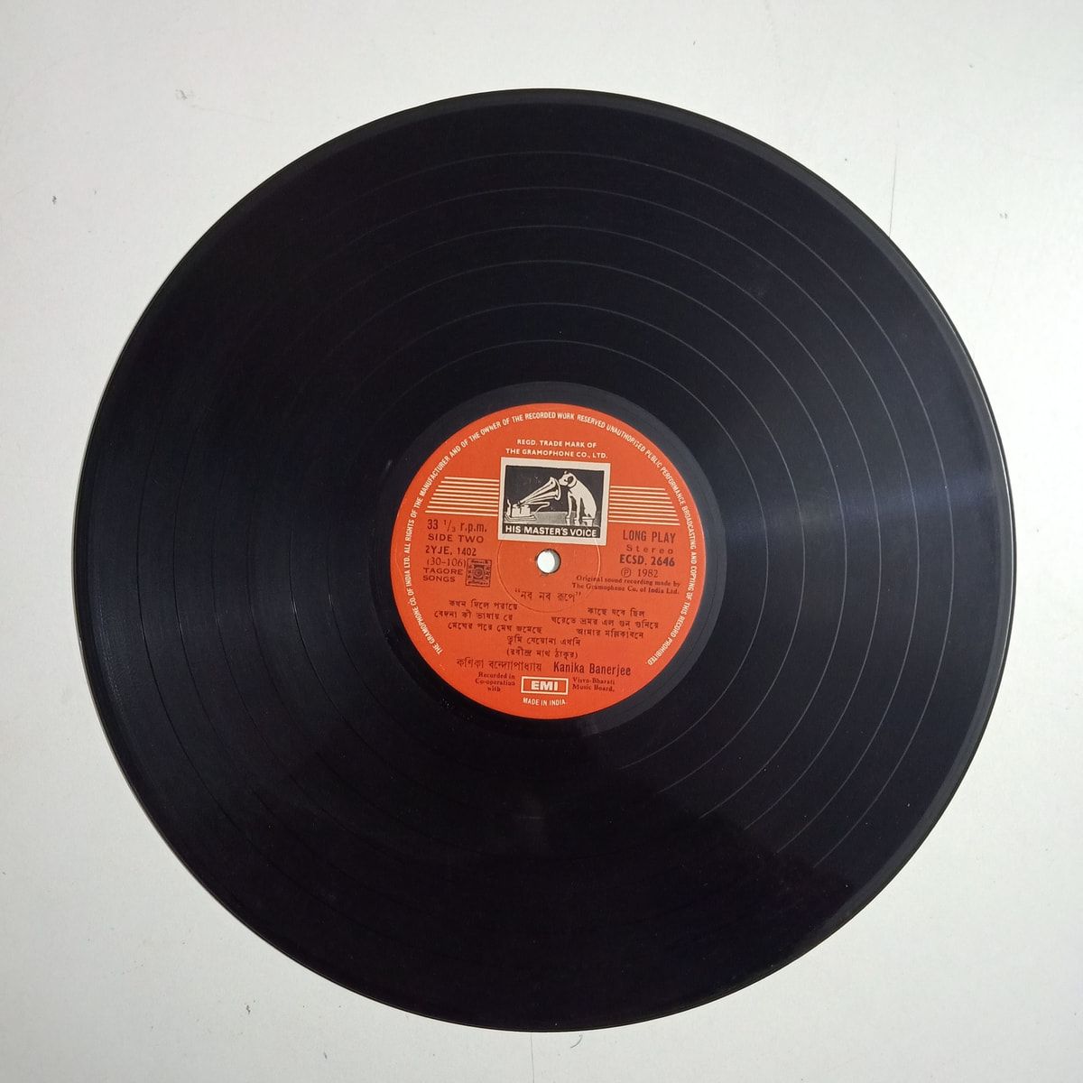 Echoes from 1982, deep in the grooves—Kanika Banerjee’s voice still finds its way through the wear and crackle of this original EMI pressing. The cover bears the brunt of time, and the record itself is far from flawless, but for serious Rabindra Sangeet collectors, this LP is a rarity, more felt than seen. Every pop and hiss is a layer of nostalgia, and there’s real beauty in a record touched by so many years. Whether for sampling, memories, or the simple joy of holding a piece of Bengali musical history, this is a find for those who appreciate stories in every scratch. Buy Naba Naba Rupe – Songs of Rabindranath vinyl LP in Poor condition Today!