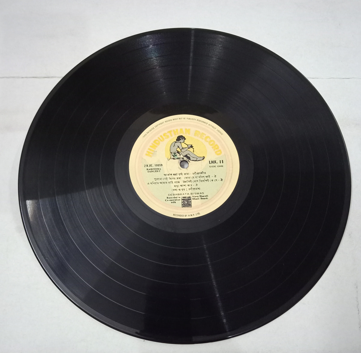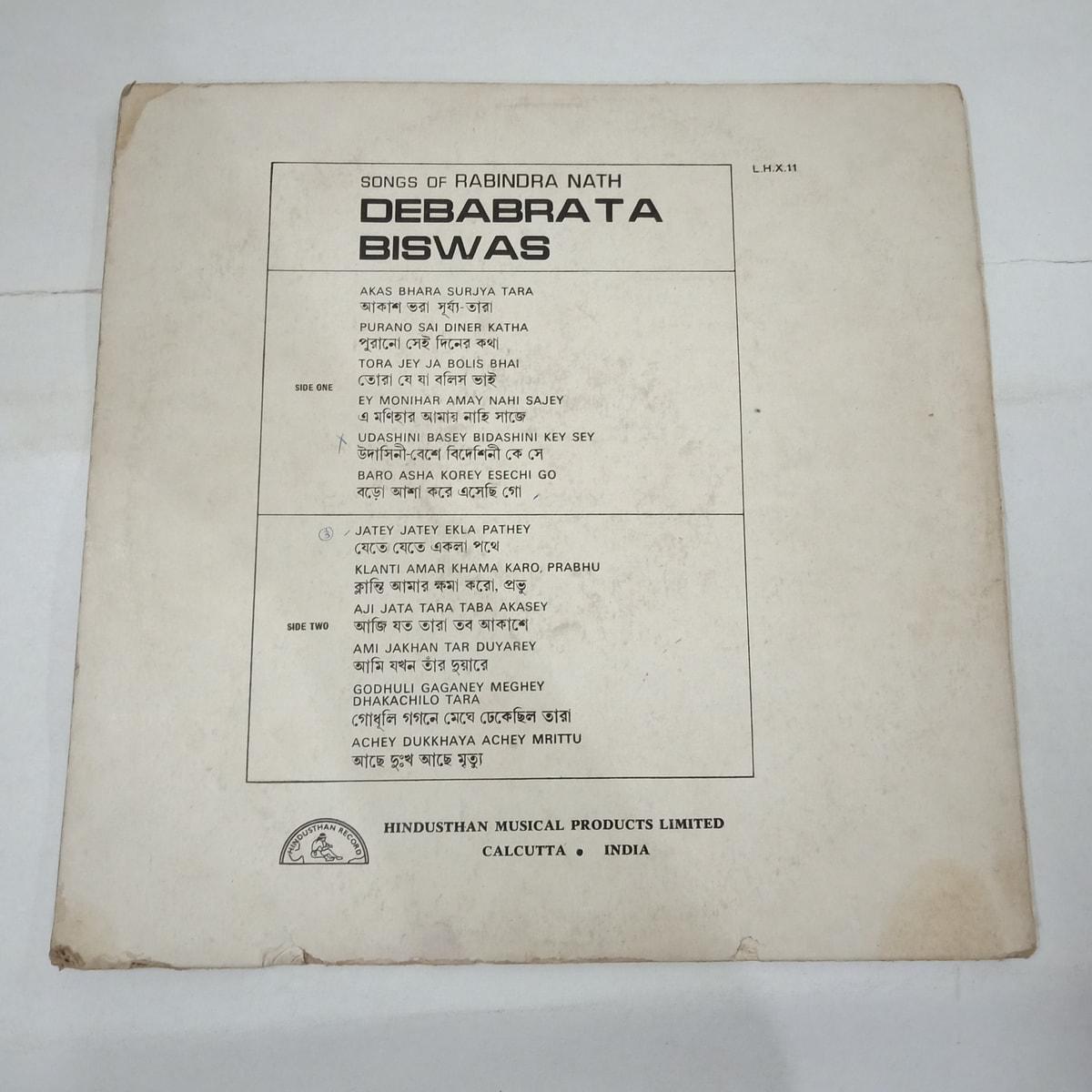 There’s a certain hush that falls when Debabrata Biswas starts singing Tagore — and on this 1962 Hindusthan Musical Products LP, that hush feels almost sacred. The record itself is in Very Good condition, with those slightly worn-in grooves that often sound sweeter than shrink-wrapped reissues. The cover sits at a solid Very Good Minus: light shelf wear and minor aging, the kind of patina you expect from a Bengali classic that has actually lived on a few shelves.