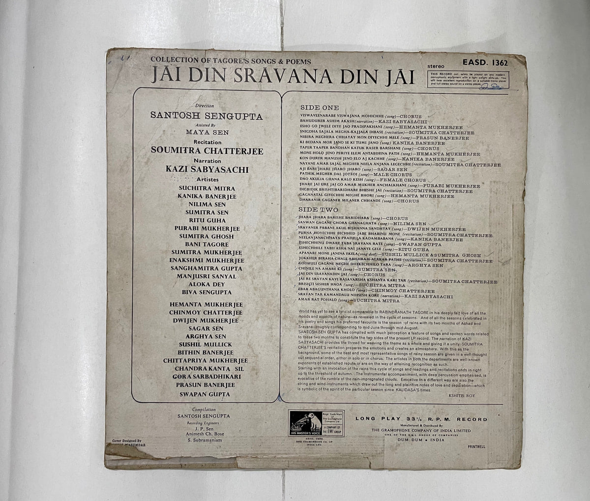 An original EMI Bengali LP from around 1970, “Tagore Songs and Recitations” captures that intimate, living-room feel of Rabindra Sangeet on a quiet evening. The jacket has clearly seen years of handling and shelf life, but the record itself plays in Very Good Minus with that gently lived‑in warmth collectors secretly love. Voices sit close and human, the harmonium breathes, and the spoken word sections carry a calm, unhurried dignity that’s hard to find on later pressings. This is the sort of album you spin late at night, letting the room fall silent between tracks while the needle hums softly in the runout groove. If you’re building a serious Bengali or Tagore corner in your shelf, a ’70s EMI cut like this belongs there. Buy Tagore Songs and Recitations vinyl LP in Very Good Minus condition Today!