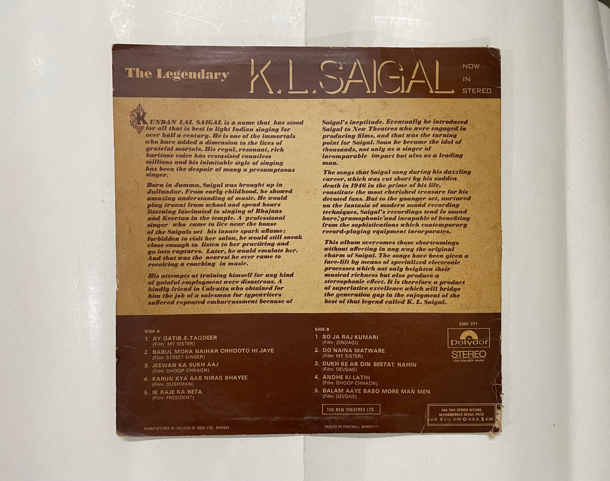 Own the timeless voice of K. L. Saigal—Buy The Legendary K. L. Saigal vinyl LP in Very Good Minus condition Today!