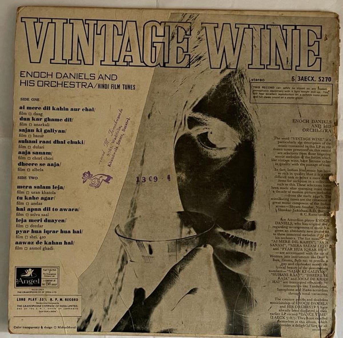 Indulge in the enchanting sounds of Enoch Daniels And His Orchestra with the Vintage Wine vinyl record. Released in 1969 under Angel Records, this Hindi Pop LP features captivating melodies in VG- condition. Add this gem to your collection and immerse yourself in the nostalgia of yesteryears. Buy Vintage Wine in VG- LP Today!